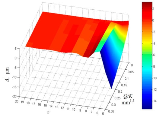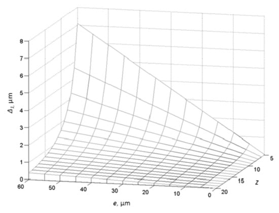 In Figure 13, the change of the total pp-amplitude of VC vibrations (Δ) is shown. Three characteristic areas can be distinguished in this diagram. The first two areas are characterized by quite high values of the total pp-amplitude. In the first area, the pp-amplitude takes values up to −15 µm and in the second area up to 8 µm. The first area refers to bearings with a total number of rolling elements z ≤ 6. Due to the small number of rolling elements the contact deformations are large in this area. Therefore, in the first region, the influence of contact deformations on VC vibrations is predominant, and the total pp-amplitude (Δ) is negative. The second area refers to bearings with a total number of rolling elements from 7 to 9. Due to the larger number of rolling elements, a significant decrease in amplitude (Δ2) occurs in this region, so high values of total pp-amplitude are a consequence of high values of amplitude Δ1. The values of total pp-amplitude in this region are positive. The third area on the diagram is characterized by a relatively low value of total pp-amplitude. The value of pp-amplitude in this region decreases with the increase of the total number of rolling elements in the bearing. This confirms the conclusion that the greater total number of rolling elements in the bearing favorably affects the dynamic characteristics of the bearing.