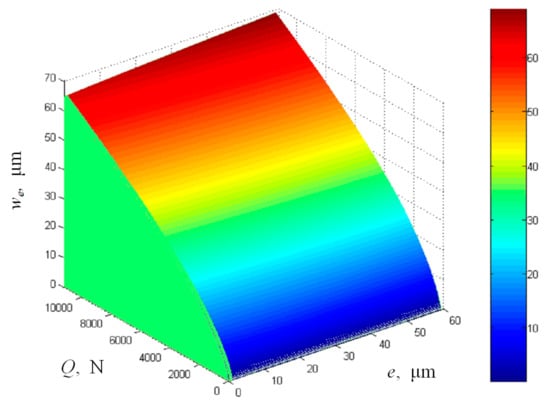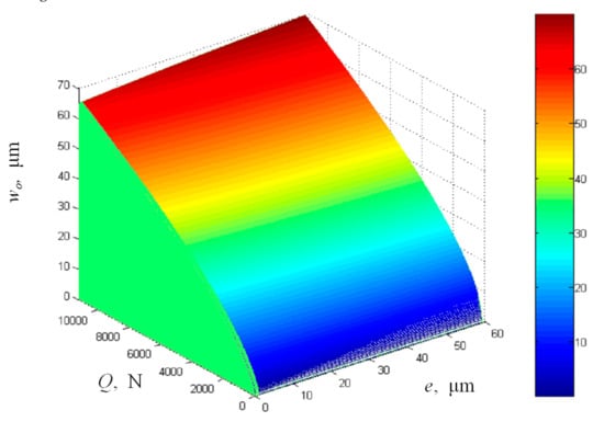 The dependence between the bearing deflection (we) and external radial load (Q) for the BSE position according to [21] can be obtained from the following equation (Figure 4b):