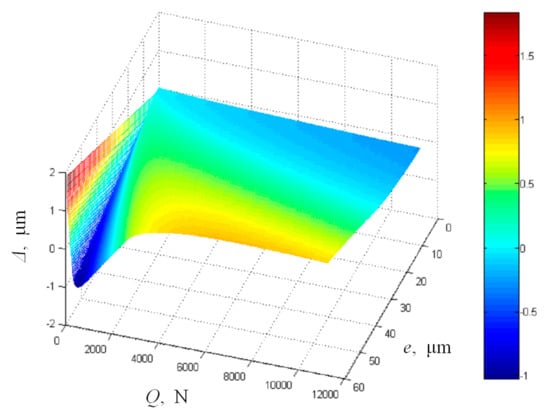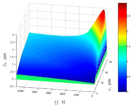Figure 6, Figure 7, Figure 8 and Figure 9 present the three-dimensional diagrams of the bearing deflection (wo) and (we) in BSO and BSE positions, as well as the sizes of the vibration amplitude due to the contact deformations (Δ2) and the total amplitudes of VC vibrations (Δ), depending on the size of the internal radial clearance and external radial load, for the 6206 ball bearing. The value of the internal radial clearance was varied in the range from 0 to 60 μm on the diagrams. That is nearly equal to the maximal recommended value of internal radial clearance for the 6206 ball bearing [30]. The value of the external radial load was varied up to a static load rating of the bearing 6206, which is Q = 11200 N.