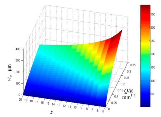 Three-dimensional dependence of bearing deflection (wo) on the total number of rolling elements (z) and level of external load (Q), for the BSO position of rolling bearing.