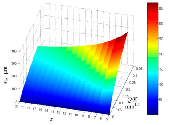 Three-dimensional dependence of bearing deflection (we) on the total number of rolling elements (z) and level of external load (Q), for the BSE position of rolling bearing.