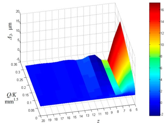 Three-dimensional dependence of vibration amplitude due to contact deformations (Δ2) on the total number of rolling elements (z) and level of external load (Q).