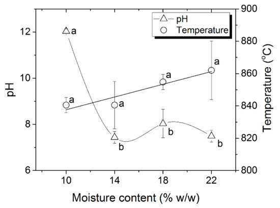 The pH and reaction temperature of biochar produced under varying biomass moisture contents (airflow 20 L/min, particle size 7 mm, and biomass compactness 0 kg). Different letters represent significant different level at 10%.
