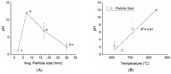 (A) pH of biochar produced from wood chips with varying particle sizes (airflow 20 L/min, moisture content 10%, and biomass compactness 0 kg), and (B) the correlation between pH and reaction temperature. Different letters represent significant difference level at 10%.