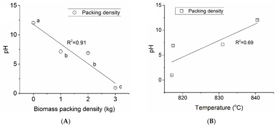 (A) pH of biochar from wood chips produced at varying biomass compactness (airflow 20 L/min, moisture content 10%, particle size 7 mm), and (B) the correlation between pH and reaction temperature. Different letters represent significant difference level at 10%.