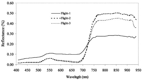 Reflectance (%) of the corn response during different flights under normal nitrogen rates and no weed control [21], Copyright Elsevier, 2003.