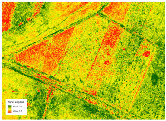 It has been shown that using satellites’ multispectral images, it is possible to detect the location of crops [22], but the resolution of satellites images does not allow early detection of the phytosanitary of individual lots of plants. Regarding the phytosanitary status of the plants, the water and the type of soil are two components that play an essential role in their health. In 2017, Bolaños et al. [23] proposed a characterization method using the visible and infrared spectrum to identify these components, through low cost cameras with two different filters, Roscolux #19 and Roscolux #2007, and a multi-rotor air vehicle. Through this method and using portable and highly qualified devices, those hard-to-reach places were monitored and analyzed to detect anomalies that may cause diseases in the crop. This monitored phase provided a characterization of the Normalized Difference Vegetation Index (NDVI), as seen in the example of Figure 3, which was used to categorize essential characteristics of the crop, such as crop health, diseased plants or soil, and water or others.