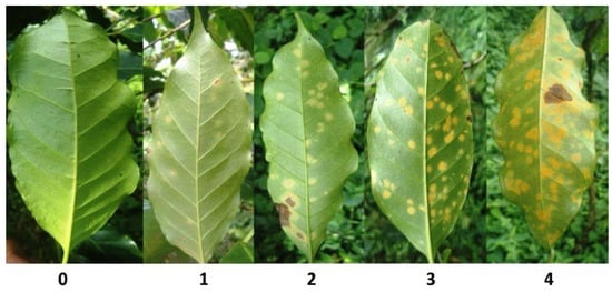 The detection of visual symptoms uses the changes in the plant’s appearance (colors, forms, lesions, spots) as an indicator of it being attacked by a disease or pest [15]. In the survey of Hamuda et al. [26], image based plant segmentation, which is the process of classifying an image into plant and non-plant, was used for detecting diseases in plants [27]. For instance, for the evaluation of the CLR’s infection percentage in a specific lot, the number of diseased leaves in 60 random trees had to be divided into the total number of leaves in those trees and multiplied by 100 (see Equation (1)). A leaf is considered diseased with CLR when chlorotic spots or orange dust are observed on it. The severity of the disease can be divided into five categories depending on the number and diameter of rust orange spots, as seen in Figure 4.