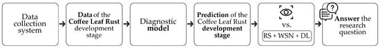 The presented state-of-the-art showed that several researchers sought the detection of any vital element like water stress, nitrogen levels, and vegetation indexes that could lead to an improvement of production and quality in crops, which translated to an increase in profitability. However, most of the research did not integrate different means of detecting CLR to have more insights and better accuracy in predicting this disease. Furthermore, the determination of the infection percentage of the crop through visual inspection is a tedious task, which is also laborious, time consuming, and subject to human error and inconsistency [46]. For this reason, the objective of this research is to evaluate to what extent it is possible to diagnose the CLR development stage in the Colombian Caturra variety (the most susceptible to the disease) through a technological integration system that involves Remote Sensing (RS), Wireless Sensor Networks (WSN), and Deep Learning (DL). Adequate management of CLR could preserve the quality and selling price of the final product, reduce production costs by rationing control costs, and protect productivity. The present research aims to facilitate the management of the most dangerous disease in the Colombian Caturra variety’s coffee production to strengthen the profitability of the rural inhabitants.
