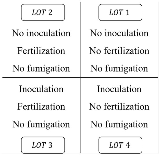 Furthermore, an engineering team was dedicated to the design and assembly of a system, in the same greenhouse, that integrated RS and WSN. It allowed building a scale crop, recording different characteristics of it regularly, and storing them on a remote server to analyze its phytosanitary status later using DL. In that way, once the plants were inoculated and the system was verified, they were transplanted to it so that the data collection may begin. For that purpose, the scale crop was divided into four lots with certain differences in their agronomic management, which sought to recreate various circumstances of a real coffee crop. Thereby, a greater number of scenarios were covered, and the false positive rate regarding the diagnosis was reduced. LOT 1 contained four non-inoculated plants, and they were neither fertilized nor fumigated; LOT 2 had four non-inoculated plants and was fertilized but not fumigated; LOT 3 had four inoculated plants, and they were also fertilized but not fumigated; and LOT 4 had four inoculated plants, and they were neither fertilized nor fumigated. The previous distribution can be seen in Figure 6.