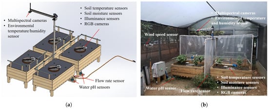 To evaluate to what extent it was possible to diagnose the CLR development stage in the Colombian Caturra variety through the integration of RS, WSN, and DL, it was necessary to obtain empirical evidence employing an experiment. Therefore, an experimental testbed prototype was built, which included a scale coffee crop. This testbed was capable of simulating different agronomic conditions and allowed capturing data for diagnosing the disease. The experimental testbed consisted of a data collection system prototype that integrated remote sensing and wireless sensor networks. In this testbed, the coffee plants were grouped, combined with the soil, and then divided into four lots. Furthermore, they were separated to inoculate CLR in half of them, and after that, the four lots were assembled again. For their agronomic management, fertilizer and fungicide were distributed and incorporated. Then, each lot was isolated from the others to make the four lots independent, and the whole scale crop was combined with a rain emulation system and a wind system. Both rainfall and wind speed for the whole crop were perceived. Furthermore, using sensors in each lot, pH, illuminance, temperature, humidity, and electrical conductivity were perceived, which will be further called “sensor data”, and RGB and multispectral images were captured. RGB pictures were acquired through a regular RGB camera with a resolution of 720 p. These cameras were positioned on the bottom of the plants since CLR was commonly visible at the underside of the leaf [10]. Regarding the multispectral cameras, which allowed capturing the reflected radiation of wavelengths that were not perceptible to the human eye, two cameras from MAPIR®, called Survey3, were used. Based on the information cited in the state-of-the-art [21,23,25], the Red + Green + NIR (RGN) and Red Edge (RE) camera filters were chosen as being suitable to identify crop diseases, including CLR. Thus, one camera centered in the wavelengths 660 nm–550 nm–850 nm and another one centered in the 735 nm wavelength were selected to capture images from the top of the plants. The Survey3 incorporated a Sony® Exmor R IMX117 12MP sensor and a sharp non-fish eye lens for perceiving light in specific wavelengths. The created experimental testbed is shown in Figure 7.
