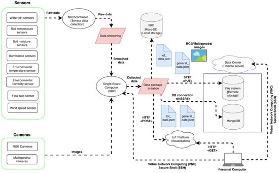 To clarify how a data collection routine worked, Figure 9 details the whole pipeline from the sensor readings and image captures until the remote storage. The data from sensors were gathered and smoothed by a microcontroller. RGB and multispectral images were captured by the cameras. The totality of the data was collected by a Single Board Computer (SBC), which continually notified the progress to the Internet of Things (IoT) platform (see Figure A3 inside Appendix C for the IoT platform dashboard) while it created a single data package. The package containing the documents with the lots and general data, as well as the images was stored locally. Furthermore, the documents were inserted into the remote MongoDB®, which resided in the data center, and the entire data package was uploaded via Secure File Transfer Protocol (SFTP) to the data center’s file system. At that point, the data collection routine finished.