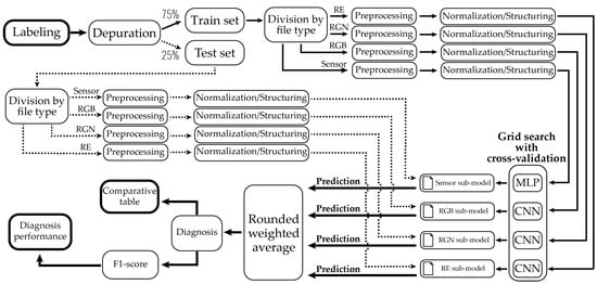 At this point, the data that were kept to be only incorporated at the time of the diagnosis evaluation were brought up. First, the submodels were loaded. Then, each lot’s data directory contained in the test set was submitted to the following process. At the beginning, its data were divided according to the file type. After that, each type was sent to its corresponding submodel, where it was first cleaned, normalized, and structured, applying the same particular procedures that were used to prepare the data for the submodel generation. Subsequently, the submodel made its prediction based on the trained model output. It is also relevant to mention that, considering that the diagnosis was made at the lot level, the RGB submodel could be used up to four times per lot data directory before retrieving its result (which was the rounded average of its predictions). The final step consisted of combining the outcomes of the four submodels and calculating their rounded weighted average, the weights being the respective F1-scores. Thereby, the definitive lot’s CLR diagnosis was obtained, and it was recorded along with the processed lot’s data directory label. Once the whole test set was covered, a table showing comparative results was generated for the statistical analysis, and the performance reached by the composite model was assessed with the calculation of the F1-score. Figure A2 from Appendix B illustrates the above machine learning pipeline in a detailed manner, and Table 3 shows the selected hyperparameters and obtained F1-score for each of them. Table A1, Table A2 and Table A3 from Appendix D details the architectures of the submodels.