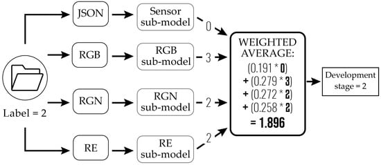After the two sets were correctly obtained, one submodel was generated for each file type, i.e., sensor data (JSON), RGB, RGN, and RE. For the JSON files, Multi-Layer Perceptron (MLP) was used, whereas Convolutional Neural Networks (CNNs) were implemented to classify the RGB, RGN, and RE images. For that purpose, the data in the training set were first divided into four subdirectories according to the file type, while preserving the same structure. Then, each of them was preprocessed so that the noise was removed from the images, and the irrelevant keys in the documents were also identified and eliminated. Figure 11 illustrates an example of preprocessed image files.