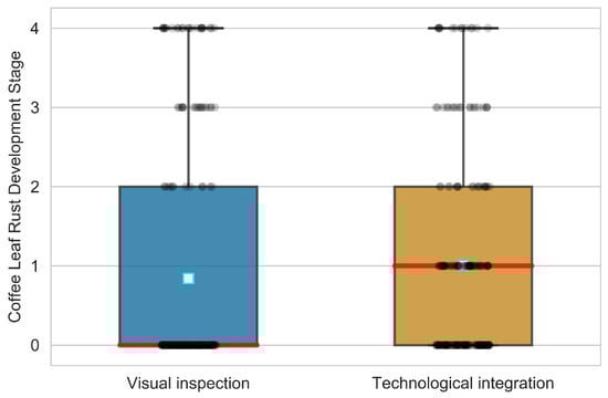 In that sense, the study factor was the type of inspection, which had two levels (“visual inspection” and “technological integration”), and the response variable was the development stage of the disease, which was a whole number between 0 and 4. Thereby, the fundamental hypothesis to prove, presented in Equation (2), helped by deciding whether Treatments 1 (“visual inspection”) and 2 (“technological integration”) were statistically equivalent with respect to their means [47].