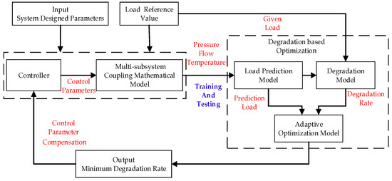 Here, the framework of degradation-based optimization (DBO) was developed. The flow diagram of the developed DBO framework for SCRS is shown in Figure 1. In the operation of the SCRS, the load prediction model predicts the actual load of the compressor, and the degradation model calculates the degradation rate of the system based on the prediction results. At the initial time, the degradation rate of the system was very low and close to zero. With the degradation of the system’s regulating performance, the degradation rate gradually increased. The adaptive optimization compensation model generates control parameter compensation to compensate for the degraded part, which minimizes the degradation rate of the whole system and ensures the acceptable regulation accuracy and performance of the system.