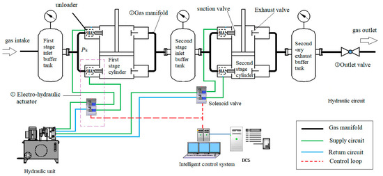 The object studied in this paper is a two-stage reciprocating compressor with SCRS, as shown in Figure 3, including a control system, hydraulic system, gas pipeline, buffer tank, electro-hydraulic actuator, etc. The main operating parameters are listed in Table 2.