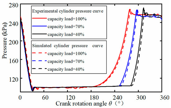 The measured and predicted cylinder pressure in one cycle of the compressor under three typical load conditions (100%, 70%, 40%) is shown in Figure 5. A step decrease was designed for the first-stage load ratio (80–60%) and the second-stage load ratio (80–50%) at 50 s, respectively. The change of the buffer tank pressure is shown in Figure 6. Compared with the measured results, the simulation results exhibit good consistency over different load conditions. The results verify that the presented model is acceptable and valid.