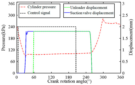 The relationship among the control signal (60% load), the displacement of the suction valve plate, the displacement of actuator, and the pressure in cylinder with a crank angle under the capacity regulation condition is shown in Figure 7. It can be clearly seen that the delay from the high-level control signal to the start of the movement of the unloader is about 50° caused by the opening delay of the solenoid valve, and the moving time of the unloader is about 6°. The delay from the low-level control signal to the start of the reset of the unloader is about 47° caused by the closing delay of the solenoid valve, and the reset action time of the unloader is about 12°.