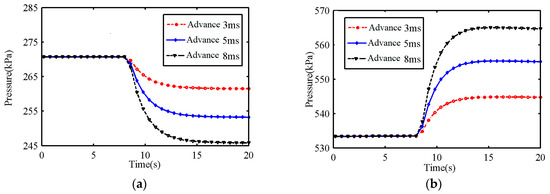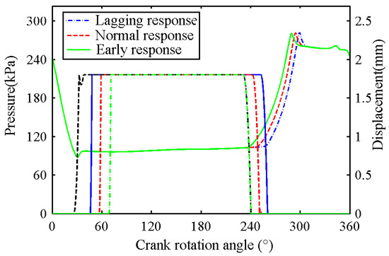 The influence of the dynamic response of the solenoid valve on the dynamic process of the suction valve plate, and the dynamic pressure in the cylinder is illustrated in Figure 11. The dynamic characteristics of the solenoid valve affect both the actuator’s extension and retraction movements.