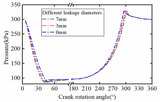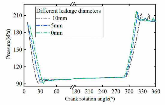 Under 40% load regulation condition, the comparison of the pressure curves in the leakage holes of the suction valves with different diameters is shown in Figure 14. The angle at the end of the expansion process is advanced from 35° to 25°, and the angle at the beginning of the exhaust process is delayed from 315° to 327° when the diameter of the leakage hole of the suction valve changed from 0 to 10 mm. In order to further analyze the influence of the leakage on capacity regulation, the changing trend of the ratio between the area of the indicator diagram with different leakage diameters and the area of the indicator diagram without leakage at full load is shown in Figure 15. It can be seen that the capacity control effect was larger than the design value caused by the suction valve leakage.