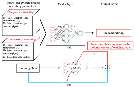 The load prediction model is the most important part of the whole compensation-based optimization framework. Generally speaking, the load prediction model can be realized through mechanism modeling, but the mechanism model requires a large number of system structure parameters and process parameters which are not even measurable. Therefore, these models are unsuitable for engineering applications, especially in real-time control systems. Encouragingly, artificial neural networks (ANNs) have been widely used in reciprocating compressor modeling and system optimization due to their advantages of being adaptive, self-learning, and fault-tolerant and working with nonlinear mapping. Belman et al. set up a physical mechanism model and an artificial neural network model of a reciprocating compressor, respectively, with an experimental refrigeration device as the research object and analyzed and compared these models through parameters such as exhaust volume, exhaust temperature, and energy consumption [13]. Barroso-Maldonado et al. developed two models: one using an artificial neural network and another one using a probabilistic neural network to predict and simulate the behavior of a reciprocating compressor [14]. The artificial neural network models for the non-injection, vapor injection, and two-phase injection heat pumps were developed to predict the performance indexes during cooling and heating seasons [15]. An ANN was trained and validated with the experimental data and the same was proposed for the predicting performance of a work recovery scroll expander in closed-loop operation with a CO2 refrigeration system in the sub-critical zone [16]. In addition, artificial neural networks are also widely used in parameter and system optimization. Mohammadi et al. assigned an ANN to investigate a logical interaction among dependent and independent variables and to define a cost function based on the empirical data; then the function was optimized by Genetic Algorithm to determine the best amount for each parameter [17]. A hybrid ANN model was trained as well as tested with experimental data sampled from statistical methods, and the model was used to predict the optimal process parameters of injection molding process of a bi-aspheric lens [18].
