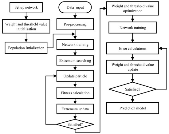 A BP neural network is an artificial neural network based on a back-propagation learning algorithm, which is the main component of an artificial neural network [24]. Most of the existing BP neural network models are variations or improvements of the standard BP neural network model. In this study, the improved PSO-BP neural network is used to build the load prediction model. The structure of the prediction model is illustrated in Figure 16. The initial thresholds and weights of the BP neural network are obtained through PSO optimization. Then the improved BP neural network is trained. The flow chart is plotted in Figure 17.
