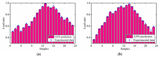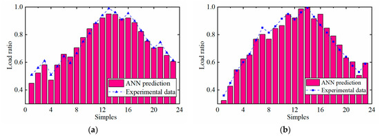 Figure 18 displays the comparison of the test results of the conventional ANN model and the experimental data. It can be seen that the overall prediction trend is acceptable. To further evaluate the conventional ANN model, prediction errors are shown in Figure 19. It can be concluded that the ANN model had high prediction errors at some points. As can be seen in Figure 19a, the maximum prediction absolute error of the first-stage load ratio reached up to −0.12, and the maximum prediction absolute error of the second-stage load ratio was −0.1. Most of their absolute prediction errors were between −0.05 and 0.05. Figure 19b indicates the relative prediction errors. It can be observed that their relative prediction errors were in the range of −12% to 8%.