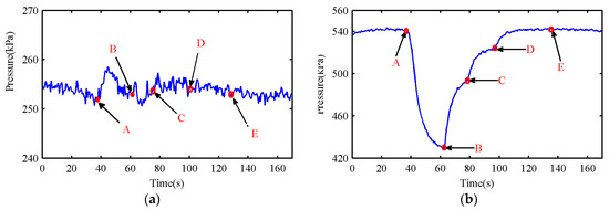Figure 24 shows that the system was in normal operation until point A, and the pressure of the first and the second exhaust buffer tank were stable at 251 kPa and 541 kPa, respectively. Leakage holes were made in the first-stage suction valve between point A and point B, and at the same time the second-stage hydraulic oil was rapidly cooled from 35 to 25 °C. When the steady-state point B was reached, the system optimization function started to work, and the adaptive control parameter compensations were generated. Similarly, the optimized compensations were generated at the stable point C and point D, respectively. The compensation amount and predicted load at different points are shown in Table 6. Since the compensation amount was generated adaptively according to the degradation rate of the system, the compensation amount decreased with the decrease of the degradation rate. At point B, the system degradation rate was 12.28. With the help of optimization, the system degradation rate eventually decreased to 1.41, which is very close to 2.03 under normal conditions. The deviation between the final pressure at the optimized completion point E and the pressure under normal working conditions was 1 kPa. The adaptive optimization strategy ensured that there was no over-optimization in the case of errors in the load prediction, and the duration of the whole optimization was 50 s.