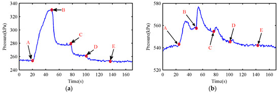 (a) First-stage exhaust buffer tank pressure of Experiment 1; (b) second-stage exhaust buffer tank pressure of Experiment 1.