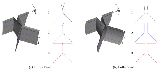 For the purpose of simulating normal vocal fold vibration, we select two different prephonatory shapes, that is, convergent and divergent, the two most dominant modes, that is, and 16 phases during one vibration cycle to generate 64 shapes in total. Note that the contact surface is calculated as an average of the left and right surface coordinates and the contraction and expansion parts are extruded based on the generated medial surface. The resolution of the uniform surface mesh is cm. The representative convergent and divergent generated shapes at fully closed, fully open and in between fully closed and fully open phases are illustrated in Figure 3 and Figure 4, respectively.