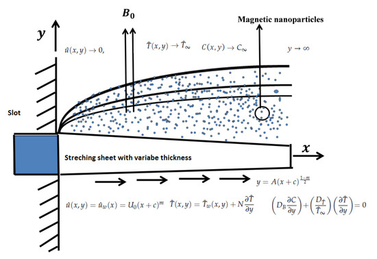 We have consider a mathematical model for MHD steady flow of change in viscosity on Eyring-Powell nano-fluid flow over a nonlinear stretching sheet along with double stratification. The flow is produced by a nonlinear stretching sheet. Moreover, the highlights of thermal conductivity and zero mass flux condition are taken into account. The sheet is stretched with velocity , assume the sheet is designated with profile here stretching rate, c dimensionless constant, A represents constant, m represents stretching index. Moreover, it is supposed that the model needs to be satisfied individual for , because for , it decreases to flat surface. A magnetic field is applied normal to the sheet, vertical to the surface (see in Figure 1). The assumption of rate process is used to obtained the Eyring Powell model (1994) in order to explain the shear of non-Newtonian flow. Akber et al. [26] evaluated the shear stress of in Eyring Powell model as