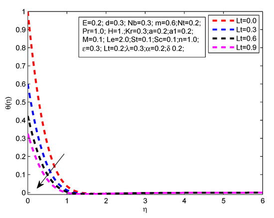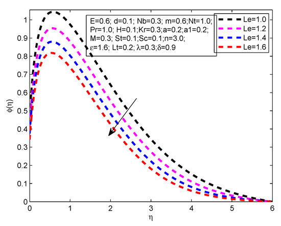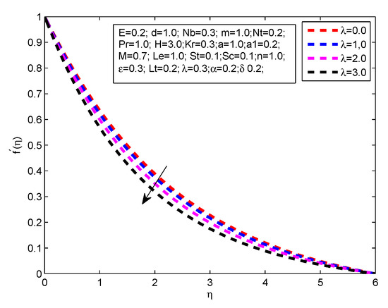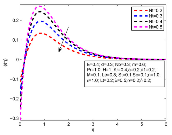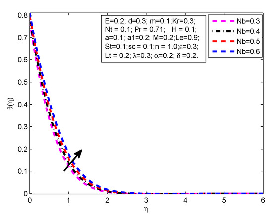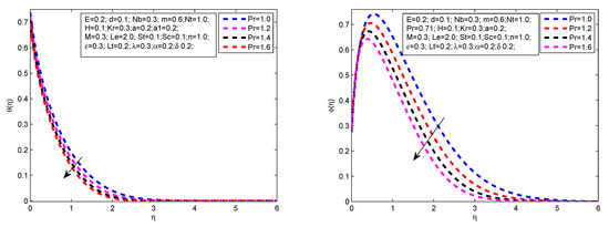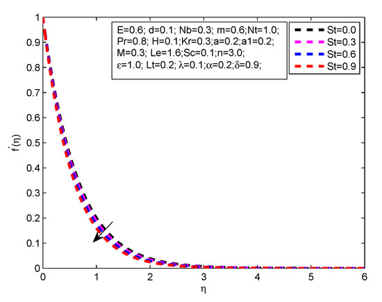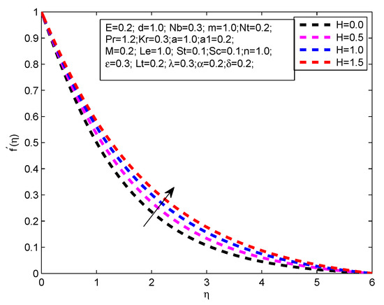 The system of the governing Equations (19)–(21) are solved numerically by using shooting method. We have taken also the boundary condition ∞ has been replaced with 5 due to the requirement of the shooting method. The convergence has been obtained at tol , while the thickness of the boundary layer is taken between 2 and 15. Morever the current result is compared with previusaly published data see in Table 1. The variation of different physical aspects are presented through graphs (as shown in Figure 2, Figure 3, Figure 4, Figure 5, Figure 6, Figure 7, Figure 8, Figure 9, Figure 10, Figure 11, Figure 12, Figure 13, Figure 14, Figure 15, Figure 16, Figure 17, Figure 18, Figure 19, Figure 20, Figure 21, Figure 22 and Figure 23). The distribution of horizontal velocity on (thermal stratification ) shown in Figure 2. It is viewed that the velocity gradient reduces by enlarging values of . Figure 3 is sketches for the distribution temperature gradient for unlike values of . it is clear that temperature gradient increases for higher values of Plotted Figure 4 is for the variation of velocity and temperature distribution for unlike values of M. Decrease variation of velocity and temperature profiles increases by enlarge values of M. According to the Lorentz’s force theory, the behavior of magnetic field and velocity fraction is inverse. Therefore the velocity distribution is reduced by the higher values of M. Plotted Figure 5 is plotted for the distribution of concentration and temperature profiles for the distinct values of (Prandtl number ). The temperature profile decreases and concentration profile increases by increasing values of . The physical reason behind that the fluids contain a little number of have a higher thermal diffusivity, and this behaviour is inverse for larger values of Prandtl numbers. Figure 6 indicates that the significance of velocity for various values of material fluid parameter H. By increasing H the velocity decreases, hence velocity and momentum boundary layer thickness are increased.