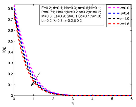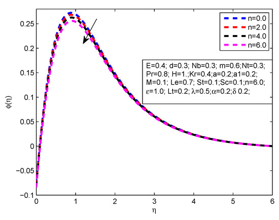 - Decrease in temperature profile is noticed for the increasing values of , , , n and M.