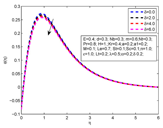 In the above expression the velocity components and are in the x and y - directions, respectively, denotes viscosity, the density of the nanoparticle, denotes the temperature of the nanofluid, represent the concentration of the nanofluid, and the concentration and temperature and along the stretching sheet. and the ambient concentration and temperature, the heat capacitance of the base fluid, the thermosteresis coefficient. The Arrhenius law in Equation (6) was obtained by Arrhenius [40], represents the modified form of Arrhenius function in which × eV denotes the Boltzmann constant, n is the unit less exponent fitted rate constant typically lies in range and E represents the activation energy. The variation in viscosity and thermal conductivity due to internal friction between the stretching surface and fluid paretical have to be taken into account, it is appropriate to assumed the mathematical formulation of the thermal conductivity and viscosity depends on temperature was investigated in [37,38,39] together with useful similarity variables as follows: