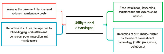 The concept and advantages of utility tunnels were discussed in previous papers [1,2,3,4]. The main advantage of this tunnel consists of hosting a wide range of urban utilities in an accessible space, such as water supply, water drainage, electrical power, gas, heat, and telecommunications. Therefore, it offers the possibility of realizing the inspection, maintenance, renovation, and extension of utilities in safe conditions without the necessity to make excavations or street cuts. In addition, it reduces traffic congestion, as well as working noise and pollution, due to pavement cutting and trenching. It facilitates the inspection of utilities and, consequently, reduces expenses related to utility maintenance. According to Reference [5], a lack of utilities’ inspection constitutes the principal utility hazard. In addition, utility tunnels contribute to the sustainable development of the urban underground space [6,7,8], because they optimize the use of this space for utilities and public services. Figure 1 summarizes the advantages of utility tunnels.