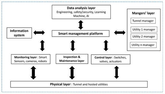 The smart system should conduct real-time and historical data analysis using engineering and security software, as well as advanced ICT (information and communication technology) tools such as machine learning and artificial intelligence. This analysis turns collected data into operating information to detect abnormal events, check the integrity of the tunnel and hosted utilities, and improve the tunnel efficiency and security via the use of a control system of the tunnel and utilities.