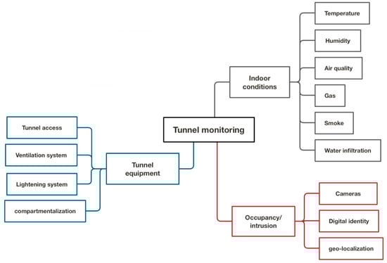 Figure 5 illustrates the tunnel monitoring. It includes smart sensors to follow indoor conditions such as temperature, humidity, air quality, smoke, gas emission, and water infiltration. Survey cameras are used to track intrusions in the tunnel. Staff access to the tunnel is controlled using a digital identification system. For each staff member, the system provides information about the identity, contact, and hierarchy, as well as authorized area in the tunnel. Presence in the tunnel is tracked using an internal geo-localization system [23,24]. At each instant, the system provides identities of staff members in the tunnel, as well as their positions. The system also provides the history of staff presence in the tunnel.