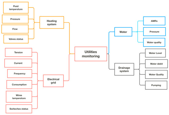 The smart technology achieved a high level of maturity in utilities management. The use of this technology in utility tunnels is facilitated by the ease of access to utilities and favorable conditions for utilities monitoring. Figure 6 summarizes the smart monitoring of the following utilities: drinking water, water drainage, district heating, and electrical grid.