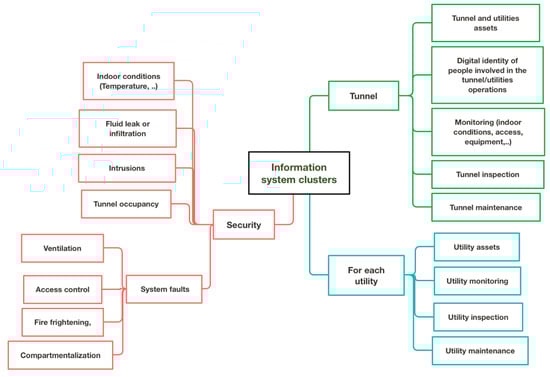Organization of the information system in clusters allows meeting the operation and security requirements of the tunnel and hosted utilities (Figure 8). The tunnel cluster includes data and information related to the tunnel and utilities assets, as well as the digital identity of staff members involved in the tunnel or utilities operation. It also includes data concerning the tunnel monitoring, inspection, and maintenance. Each utility cluster includes data related to the utility assets, monitoring, inspection, and maintenance. The security cluster includes data related to the utility tunnel security and incident management, such as indoor conditions, fluid leaks, intrusions, faults in the security system (ventilation, firefighting, compartmentalization, access control, etc.), and human presence.