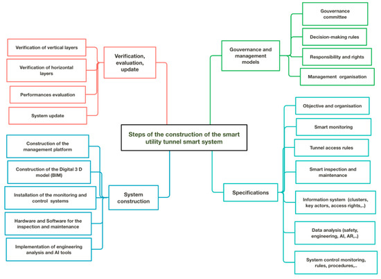 Figure 9 details the methodology of the construction of the smart system for the utility tunnel. It includes four steps: (1) setting up the governance and management system, (2) establishing the smart system specifications, (3) construction of the smart system, and (4) verification, evaluation and update of the system.