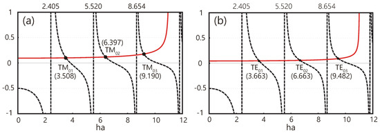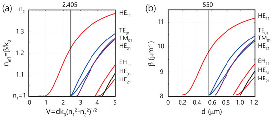 where , is the wavelength of the light, is the propagation constant, and are the electric field vector and the magnetic field vector, respectively. The longitudinal propagation constant of various modes can be determined by the eigenvalue equations of Equation (3) [1,3,45]:
