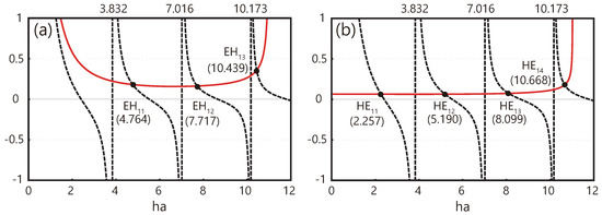 Figure 2 shows the solutions of the TM and TE modes of Equation (4) that the magnetic field (electric field) is perpendicular to the fiber axis. Both modes are placed at . That means that any non-fundamental mode is not allowed to propagate inside the fiber below the lowest cut-off value of 2.405. Therefore, the single mode condition for the silica-air waveguide is . Figure 3 shows the solutions of the EH and HE modes at . There is a lower limit in V-number for the EH modes so that the EH modes are not allowed below the single mode condition. The HE mode is only the fundamental mode which can always propagate inside the fiber since it has no cut-off value.