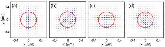 Vector field plots of the electric component perpendicular to the fiber axis in the fundamental HE mode for rotating polarization at (a) , (b) , (c) , (d) under the conditions of nm and nm.