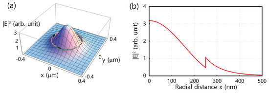 (a) The total intensity of the electric field in the fundamental mode HE with rotating polarization. (b) Radial dependence of the total intensity of the electric field. Parameters are same as used in Figure 6.