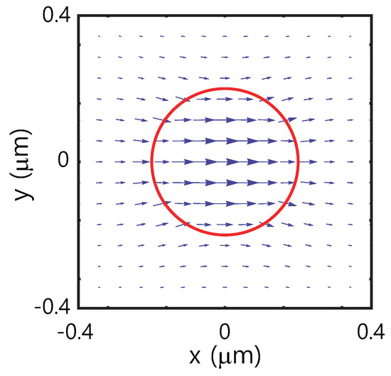 The +(−) sign in Equations (7) and (8) accounts for clockwise (counterclockwise) rotation of the polarization around the z-axis. The coefficient A is determined by the normalization condition. Figure 6 shows vector plots of the electric field component transversal to the z-axis at time , and . We perform numerical calculations for a silica-air fiber with a radius nm at a wavelength of nm. A red circle describes the fiber surface. With increasing time, the real part of the transversed electric field rotates along the circular or elliptical with respect to the fiber axis.