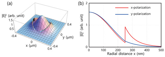 (a) The total intensity of the electric field in a fundamental mode HE with quasi-linear polarization. (b) Radial dependences of the total intensity of the electric field at (x-polarization) and (y-polarization). Parameters are same as used in Figure 6.