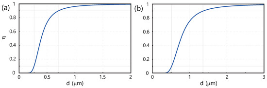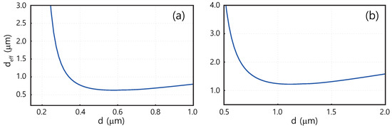 The radial and azimuthal components transversal to the fiber axis, and , describe the fraction of the energy flow of the electromagnetic field that does not propagate. The fraction of power propagating inside and outside the fiber can be given by , where and [3]. The fractional power is related to the diameter-dependent group velocity and waveguide dispersion. Figure 10 shows the fraction of power for the fundamental mode inside the core as a function of the diameter at nm and m. At nm (m), the 90% energy inside the core is confined by nm (m) of an MNF whereas the rest of the energy is confined by 270 nm (515 nm) of it. Because of the highly confined optical modes in high-index contrast structures, a tight bending radius of less than 5 m can be achieved, that results in compact guided optical components while giving more flexibilities in the photonic circuit layout [50,51,52,53]. Now, let us define the effective radius, , which is a hypothetic radius for possessing 86.5% (=1) of the total power [3]. can be obtained from for and for , where . As the diameter decreases, d is getting larger so that it leads most of light energy to propagate in air. In Figure 11, the major power can be confined within nm at nm and m at m.