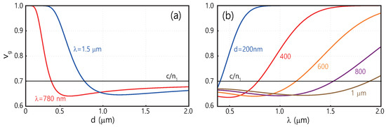Group velocity of the fundamental modes (a) as a function of diameter at nm and m, (b) as a function of wavelength at different diameters.