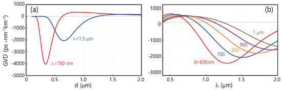 Group velocity dispersion of the fundamental modes (a) as a function of diameter at nm and m, (b) as a function of wavelength at different diameters.